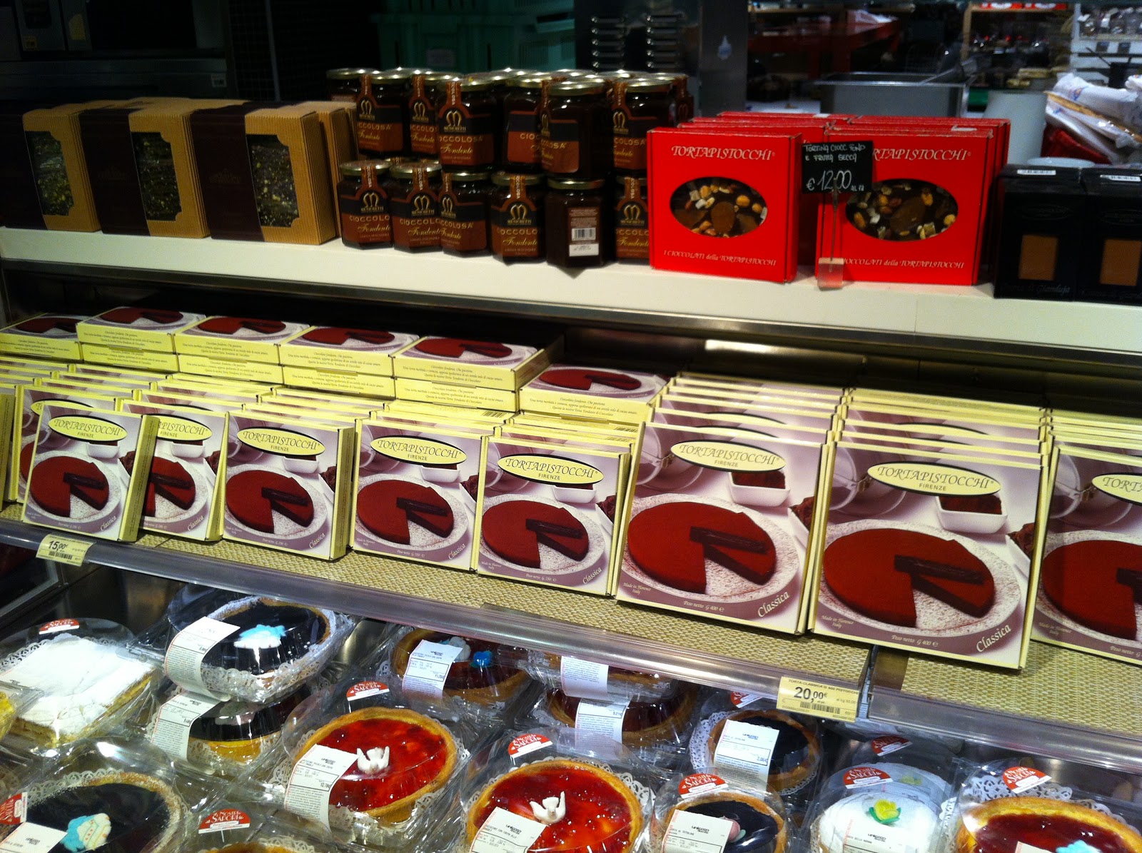 "Torta Pistocchi", que es una torta hecha a mano por la familia Pistocchi de Florencia . Con chocolate de primera calidad , no tiene mantequilla, ni harina , ni azúcar añadido. Dura 4 meses en el frigorifico sin que pierda sus cualidades, se come con un velo de chocolate amargo y es simplemente exquisita . Por supuesto la receta es un secreto.